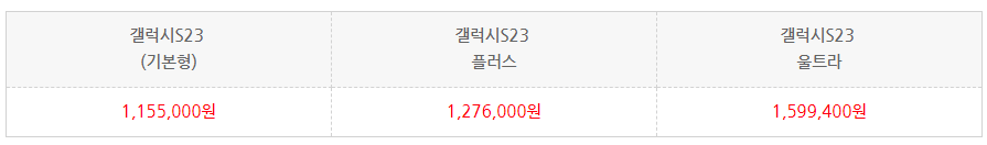 S23 시리즈의 출시 가격은 이렇습니다. 작년 S22 시리즈보다 약 10% 정도 오른 것 같습니다.