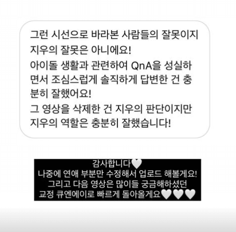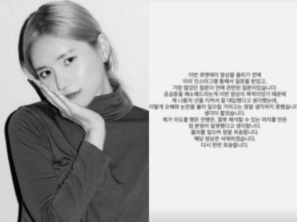 '궁금증을 해소해드리는 게 이번 영상의 목적이었기 때문에 제 나름의 선을 지켜서 잘 대답했다고 생각했는데 이렇게 오해와 논란을 불러 일으킬 거라고 정말 생각하지 못했습니다. 생각이 짧았습니다'고 밝혔습니다 '제가 의도를 했든, 안 했든 잘못 해석할 여지를 만든 점 분명히 잘못했다고 생각한다'며 물의를 일으켜 죄송하다고 거듭 사과했습니다.